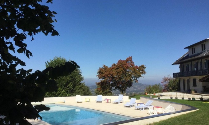 4 gites in the owners' house. 2nd and top floor: kitchen, living room (1 double bed), 1 bedroom (1 double bed), bathroom (bath). On the ground floor common laundry room in the boiler room (washing machine and dryer). Total floor area: 64 m² attic parts included. Private balcony. Common courtyard + ground. Private heated swimming pool. Lawn bowling. Summer kitchen with wood oven. Alpine skiing + Revard cross-country 12km. Aix les Bains thermal baths. Character pavilion in the heart of the Aix countryside on the Revard road, in the Bauges Regional Natural Park. Very quiet residential hamlet facing south-west. Pleasant preserved setting of meadows, hills and forests. Beautiful private terrace. Superb outdoor space very neat and flowery with heated swimming pool, bowling alley and summer kitchen. Superb very clear view on the countryside.