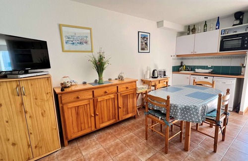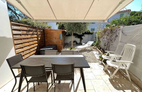 Pretty two-storey house in residence with courtyard, shared swimming pool, private parking, close to the sea. Fitted kitchen open to the living room. Upstairs you will find 2 bedrooms and a bathroom. 33m² fully enclosed courtyard with garden furniture, deckchair and awning. Swimming pool common to the residence open in July - August.