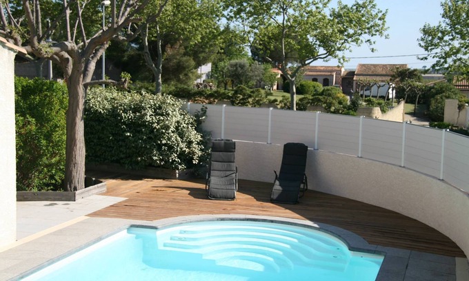 Pretty single storey villa with private and secure swimming pool 10 km from the beaches is located in Pomerols. Pretty single storey villa with private and secure swimming pool 10 km from the beaches provides accommodation, featuring Air Conditioner, Private Pool, Balcony/Terrace, among other amenities. This Villa features Air Conditioner, Private Pool, Balcony/Terrace, to make your stay a comfortable one.