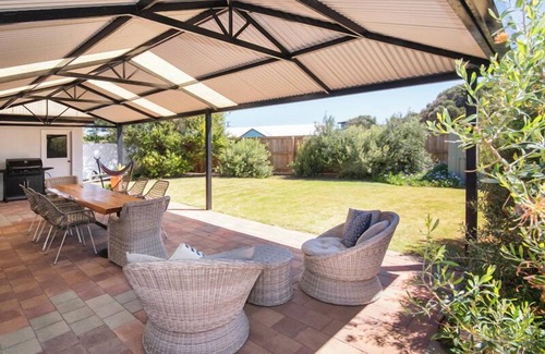 The large back patio is undercover, has a BBQ and creates a great space to relax after a morning at the beach.