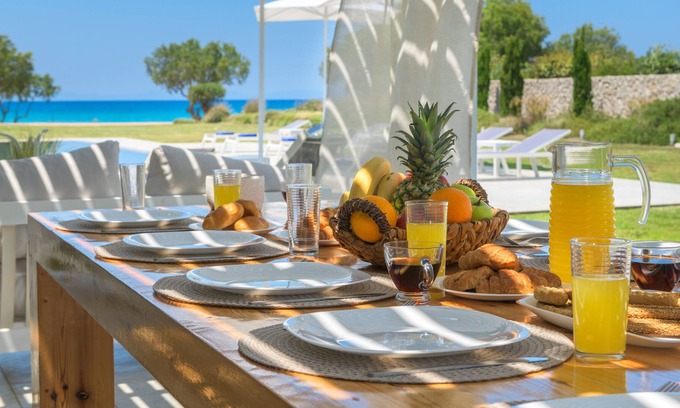 In Villa Renee, you can enjoy daily local breakfast prepared by our local cookers at your villa at requested time that can be served outdoor in front of pool\sea or indoor as requested. Villa Renee can book you on request a chef to come and cook at your house an authentic Greek cuisine or to be delivered to you. Within 200 meter walk you can enjoy the known Elena tavern right at the beach or even call for delivery from a menu placed at the villa and have a divine meal at home delivered only to Renee villa guests !