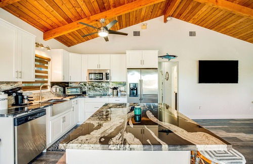 Nestled directly on a canal with prime water access, this charming family home has been completely renovated to meet your every vacation need. The stunning interior offers an open layout with wood floors, vaulted ceilings, and high-end furnishings. Kick back in the swinging chair on the wraparound deck and enjoy the coastal breeze. Make use of the gas grill and dine al fresco on the patio underneath the home. In the evening, gather for conversation next to the wood-burning chiminea. Inside your beach escape, find a pristine kitchen with a full suite of stainless steel appliances and gorgeous countertops. The living room is fitted with plenty of seating to unwind for movie nights. Added perks include a flatscreen TV in each bedroom, completely updated bathrooms, and a selection of board games for added fun.