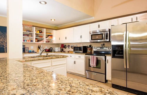 Large kitchen: full size microwave, gas stove, oven, dishwasher, double sink, refrigerator, island counter space, high def tv, stereo, dining table with seating for 14 plus 4 bar seats, coffee maker, crock pot, all cooking/eating utensils/glasses/tableware, granite counter tops