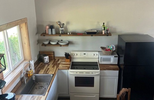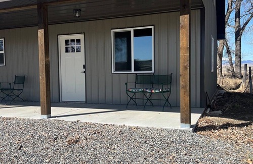 Privacy and quiet! This newly built cabin (2023), 900 sq ft in a rural setting but only minutes from Cody. This is truly a unique spot set in the mature shade trees, paths, and creek flowing 50 yards away. Access at ground level, this 2 bedroom 1 bath house, open floor plan kitchen and living room. Bathroom and laundry on main floor. Master bedroom (queen) on main level and second bedroom (queen) in the loft upstairs. House is set up for summer travelers, or extended stay worker.