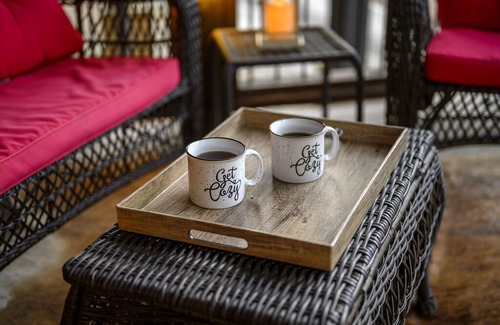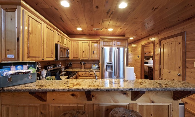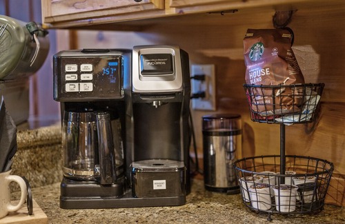 Our fully equipped kitchen has everything you need to cook all your favorite meals if you decide to stay in. It features granite counter tops, stainless steel appliances (side-by-side fridge, range oven, microwave, dishwasher), a blender, coffee maker that makes a full pot of coffee or individual K-Cups. Your first morning's coffee will be provided for you so you may want to bring your favorite coffee and/or K-cups. The kitchen opens to the dining room, where there is seating for 8 around the log table and additional seating at the bar, and the living room, where there are tall ceilings, a log-burning fireplace and amazing views of the pines.