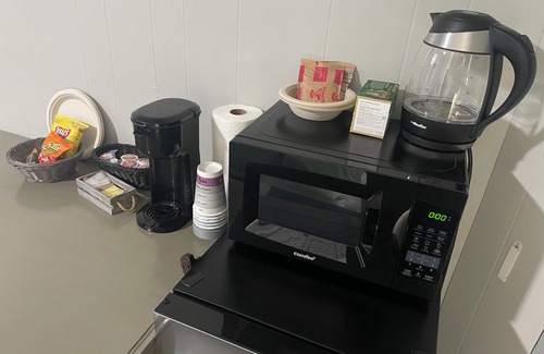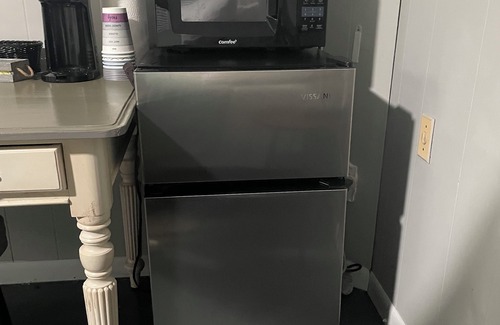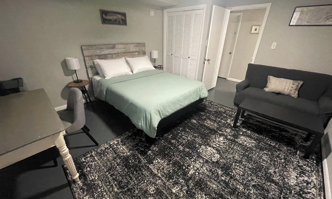 This is a private basement room with mini fridge, microwave, coffee maker, electric kettle. No kitchen. No washer/dryer. Private bathroom. Loveseat and coffee table. Comfortable memory foam queen bed. WiFi and Roku TV. Window A/C. Electric heater.