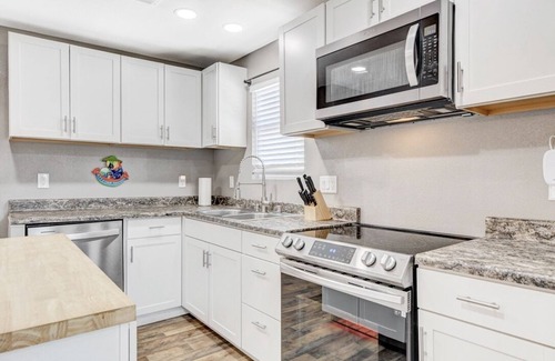 Fully appointed kitchen with stainless steel appliances, including stove, oven, refrigerator, dishwasher, and microwave. Bedrooms are comfortably furnished with fresh crisp new linens, pillows, bed coverings, and Smart TVs. Master bedroom is located on the lower level and features a private en-suite bathroom as well as a private exterior entrance.