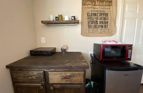 The kitchenette has a microwave, small refrigerator, coffee maker, coffee, mugs and glasses for wine. No sink or cooking space - this is more like a hotel room. Kitchenette, dining, and living room area are open concept. No propane stoves or cooking in or outside of cabin.