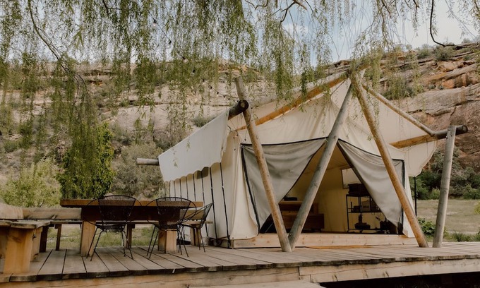 Private Canyon Glamp - 2 Lux Tents + Views + Bath is located in Cortez. Private Canyon Glamp - 2 Lux Tents + Views + Bath provides accommodation, featuring Security/Safety, Bedding/Linens, Wellness Facilities, among other amenities. This Cabin features Security/Safety, Bedding/Linens, Wellness Facilities, to make your stay a comfortable one.