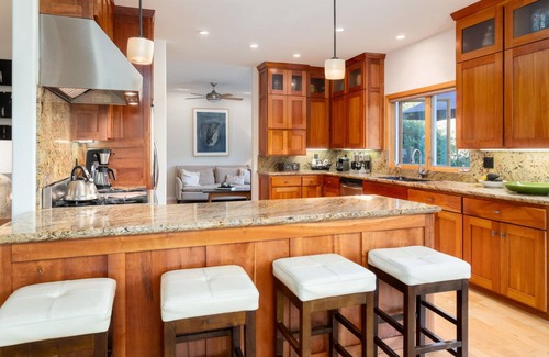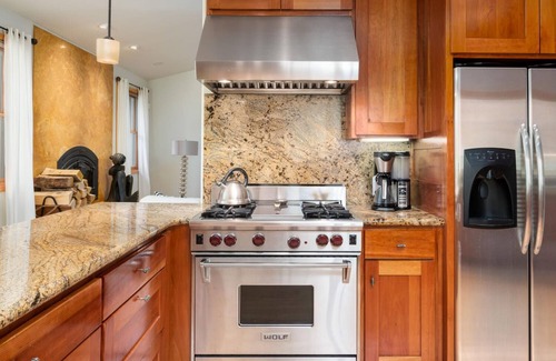 The gourmet kitchen has a Wolf range and is fully equipped. The round dining table seats 6 comfortably and is located next to the kitchen peninsula, which seats 4. There are also two large dining tables outside that seat 10 and 8.