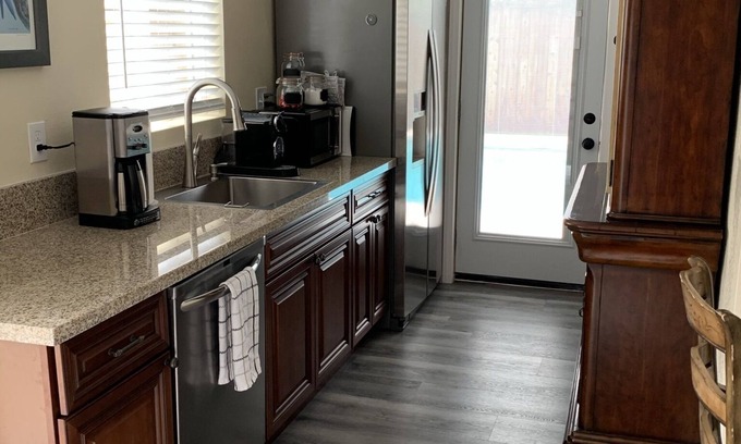 New! Private Quiet Guest House fenced in with King bed, kitchen, laundry, pool access, sitting room with matching recliners, all nestled peacefully behind the property with no neighbors. A great space for longer stays and boasts only 5 star reviews.