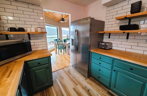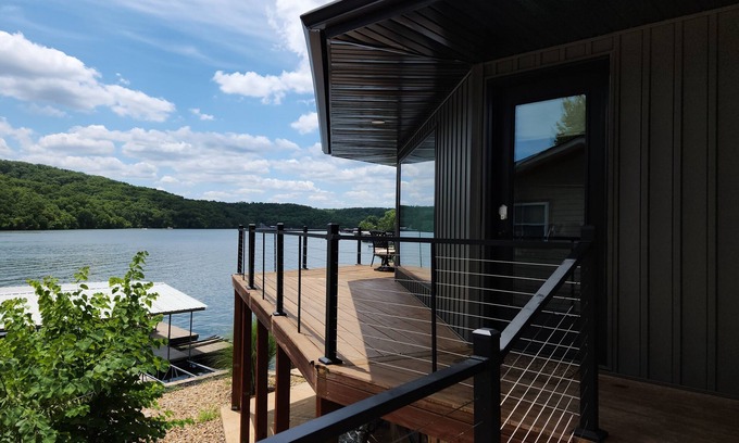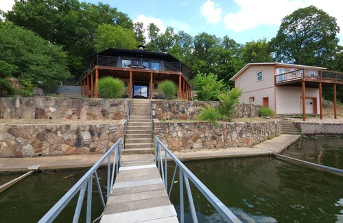 If you are looking for calm waters and a great place for family fun, the Octagon House is for you! This spacious home is located at the 5 mile marker of the Little Niangua. The 2 level Octagon House offers a total of 4 bedrooms and 2 baths. Upstairs you will find 3 bedrooms, 1 bath, newly renovated kitchen and living space. The upstairs had three bedrooms and a bathroom. Head downstairs to the master suite to enjoy the custom walk in shower and new soaker tub. The downstairs also has a large living area, a wine bar, and a laundry room with a washer and dryer. The unique octagon shape of the home allows guests to take in 180 degree views of the lake. With 198 ft of waterfront all to yourself, along with a HUGE private dock with 1 slip available for your boat and water toys, this property is perfect for guests be outside and enjoy fishing, swimming, and sunbathing. The dock is equipped with a refrigerator. If grilling outside is your thing, we have a gas grill for you in front of the house. Want to relax in the evening? This Octagon House has a Jacuzzi Hot Tub and patio to enjoy throughout your stay. If the weather turns, the home has a TV in the living area space upstairs. We also have complimentary high speed internet. This property is off the beaten path, allowing guests to relax in the tranquil environment that the lake offers. However, if you want to venture into town, the property is only 25 minutes from Camdenton, which has tons of restaurants and shopping venues for guest to enjoy. With 2 kings, 1 queen, Twin over Full bunk beds, a sleeper couch upstairs, and a futon downstairs, the Octagon House has plenty of space for all to enjoy.