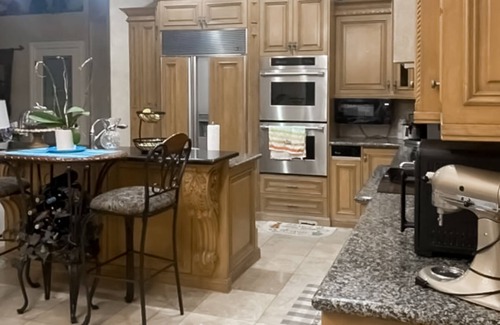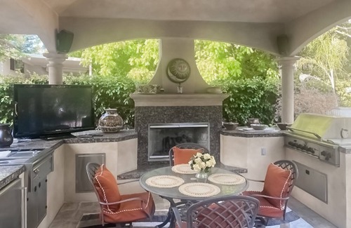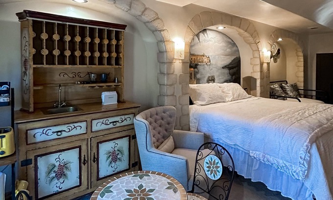 Escape to a luxurious Tuscan-style studio within a resort home in the serene surroundings of Cameron Park, CA. This spacious one-bedroom, one-bathroom studio features a fully equipped outdoor kitchen, a private balcony, and cozy amenities such as a king-size bed, twin trundle, and air mattresses if needed. Stay comfortable year-round with central AC for warm months and a fireplace for cooler evenings. The workspace with a built-in desk downstairs is perfect for remote work or planning your next adventure.