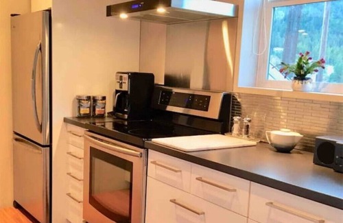 The space is a newly built apartment in a historic mixed-use building, uniquely located with the main street of town at the front of the building and the lake at the rear! It is suitable for adults who would like a private, quiet, yet central location, and includes upscale decor, appliances and furnishings. The kitchen is fully equipped with high-end appliances. If you'd like to prepare your own meals, there is a complete selection of cookware, glassware and dinnerware as well as small appliances. Morning coffee and pantry staples are provided. The dining table is roomy with comfortable seating, so go ahead, play some games after dinner!