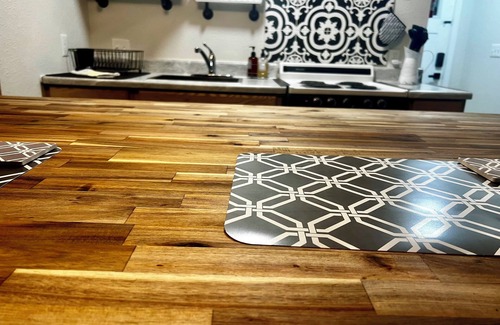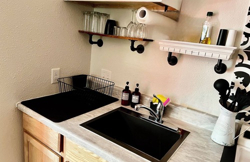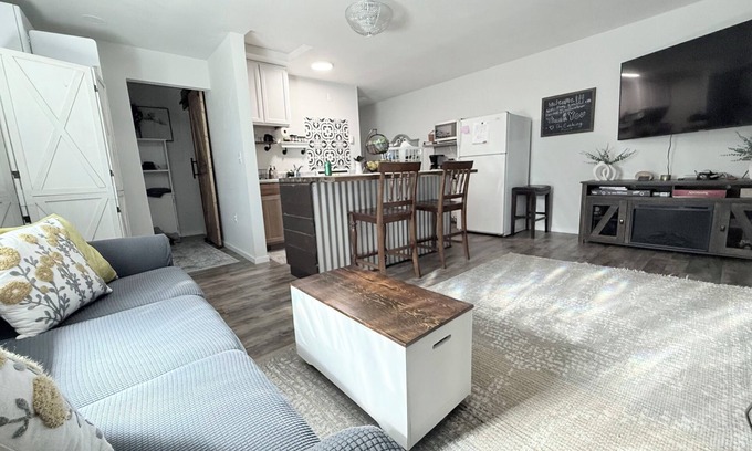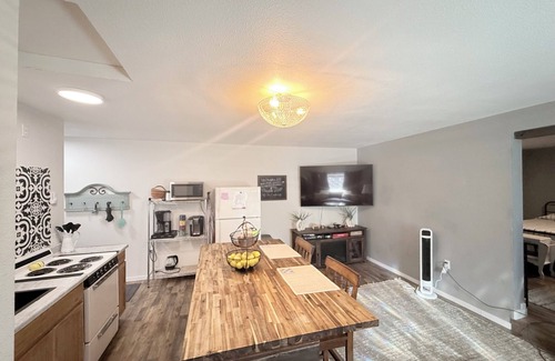 Our unique suite is tucked into a conv low activity neighborhood. Blocks from Main St library, hosp. & stores. Inset from rd. makes it quiet & private. Comfortably sleeps 4, 6 w/ pullout. Two Q beds (one firm & one soft) that give you options. Large TV, Roku, games, fast WIFI, Nintendo (old school) will keep you entertained. Abundant coffee supplies and a well stocked kitchen. Access to fenced backyard to potty your pup. Full kitchen, games, largeTV, high chair, Pac-n-Play, child locks, many coffee options and old school Nintendo. Welcome to our hidden treasure, it’s time to relax.