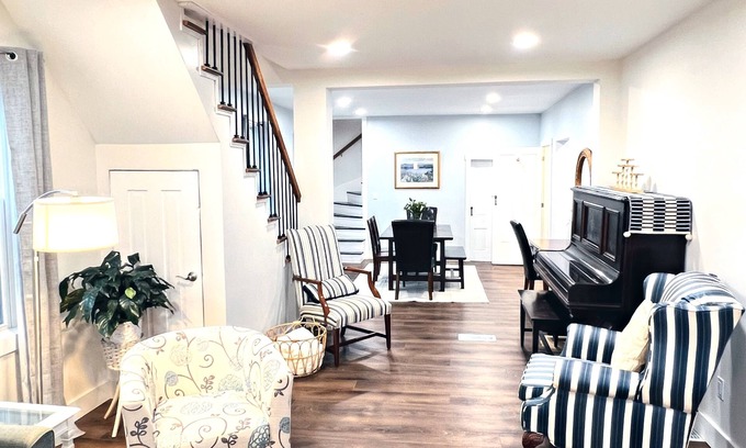 The front door opens to an open living room where guests can gather to enjoy conversation. The room offers a writing desk/workspace, sitting areas, and an antique 19th-century piano. Double French doors lead to a den with a full-size billiards table, dart board, karaoke machine, vintage record player, TV and a comfy sofa bed. The airy, informal dining room has a large table, seating 8 comfortably. The sunny kitchen has a full-size refrigerator along with new electric range/oven, dishwasher, microwave, cookware, and a coffee maker. A full bathroom with a stacked washer/dryer completes the first level.