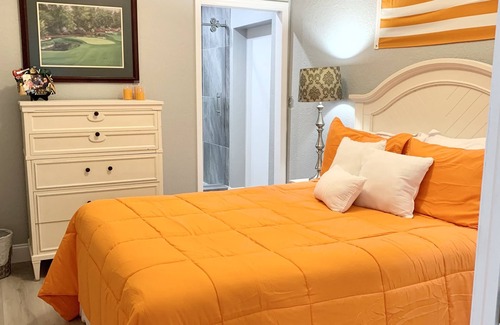 You will also have shared access to the owner's private pool (which can be heated up to 86 degrees during the months of December - March upon request) on a screened lanai where you can enjoy a refreshing dip in the water, lounge in the sun while listening to the tranquil sound of the pool’s waterfall, or simply relax in the shaded seating area. An outdoor shower allows you to rinse off after swimming, and safety pool fencing is available for younger children should it be required. To add to the experience, there is also an outdoor tv on the lanai, so you can enjoy a movie, watch your favorite sports team play, or listen to your favorite music while swimming. A small closet fridge can keep your drinks cold, and a 6-person high-top table allows for a nice dining experience as well.