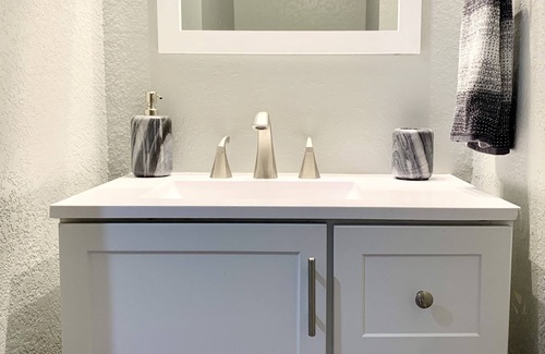The ensuite bathroom includes a single sink and toilet area, an extra-large walk-in shower with sliding glass doors, and a pocket door for privacy when desired. The wall shelf offers large plush bath towels and plenty of space to place your personal toiletries. A starter roll of toilet paper, a blow dryer, and a first aid kit can be found underneath the bathroom sink. There is also a back door that you can exit to head over to the shared pool area or easily access beach items between the buildings.