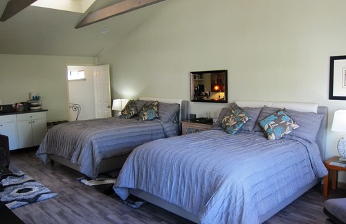 Modern Sophisticated . open concept living space. Vaulted Ceilings, lots of natural light. Spacious private bedroom with private entrance. 2 top of the line Queen size beds, European bedding, an an oversized luxurious master bathroom with spa amenities. Kitchenette, 55" Smart 4k TV, and Fireplace in bedroom. Computer desk space, seating areas.