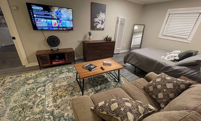 Large room downstairs with large, smart TV (Netflix included), a queen bed, couch, plus extra seating.