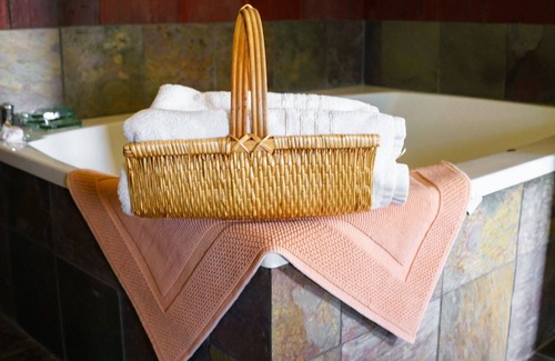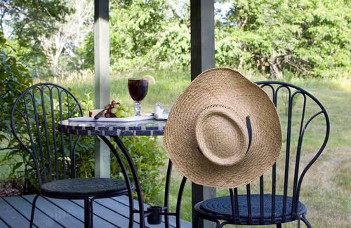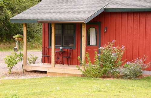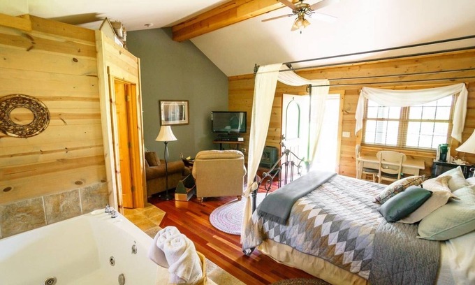 Tastefully decorated and comfortable guesthouse with a Jacuzzi tub, gas stove fireplace, bathroom, dining area, queen bed and a peaceful covered porch, on a wooded setting.