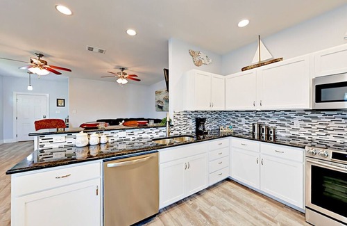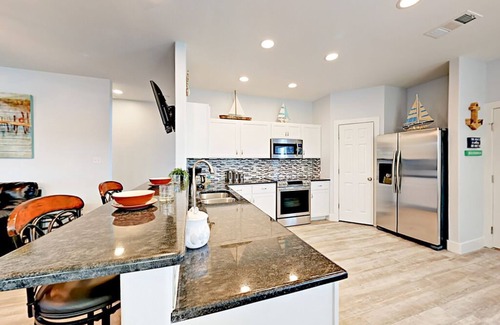 The kitchen is spacious and has granite countertops and stainless steel appliances. The bar has seating for two and the dining table will seat up to 8. The woodlook tile and new decor throughout make this an awesome place to spend your beach vacation.