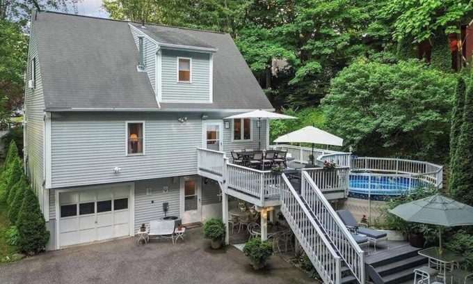 This cozy home featuring a private pool, ample deck space, fire pit, and grill is the perfect getaway destination for a group of friends or family to enjoy the best of what Litchfield County has to offer. Thick trees surround the property, providing privacy and shade during hot summer days. Entertain friends and family with a quintessential summer BBQ on the large deck, outfitted with tables, chairs, umbrellas, lounge chairs for sun bathing, string lights and citronella tiki torches for great vibes at night. Listen to your favorite soundtrack through the Sonos speaker system throughout the home and deck that you can control from your phone. After a sun-filled day in the pool or nearby beaches or boating in Candlewood Lake, unwind and relax around the fire pit with your favorite snacks and drinks. Recharge for the next day in the recently updated bedrooms, one of which doubles as a media room with a 65" smart TV and Sonos sound bar, perfect for a movie-night or binge watching your favorite show. The 2 upstairs bedrooms each have a smart TV and work station, including a desk, chair, and monitor with HDMI cord to connect your laptop. Furniture and dcor has been updated in all bedrooms and commons areas, new photos coming in spring 2024. Work from home during the day and then whip up a meal in the fully stocked kitchen that has everything an experienced or novice chef may need. Take an 8 minute walk into town for frozen yogurt, a meal, shopping, or movie on bank street and stop by 1 of 2 parks on your walk back to the property. A short drive away, you can hike Lover's Leap state park, Clatter Valley Park, or Harrybrooke Park, all of which are child and pet friendly. Take a 10 minute drive to Candlewood Lake to enjoy Lynn Deming beach or charter a boat for the day. Whether you are seeking a fun, memorable getaway or a quiet place to work from, this home is the perfect place for you.