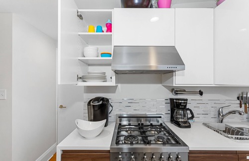 The apartment is both modern and cozy, with one private bedroom, an open sleeping alcove, and a pull-out queen size couch, both in the living room. The space is open, with hardwood floors, and high ceilings. Scroll down to the Notes section for some additional offers we have!