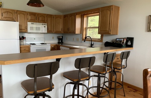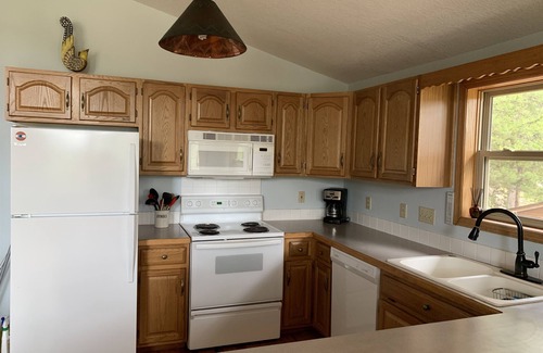 • Fully-equipped kitchen with refrigerator/freezer, oven, microwave and dishwasher and garbage disposal. Coffee-maker and toaster are available. All dishes, pots, glasses, silverware, paper products, etc., are included. Common spices and condiments are provided.