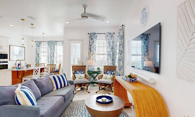 Welcome to The Sapphire Spyglass, your serene coastal retreat located in the heart of North Padre Island! Just steps away from the boat launch, city park, delightful restaurants, and the sun-kissed beach, this beautifully decorated townhome invites you to unwind in its calming hues of turquoise and blue.
