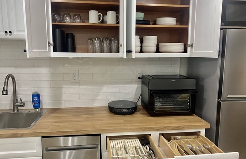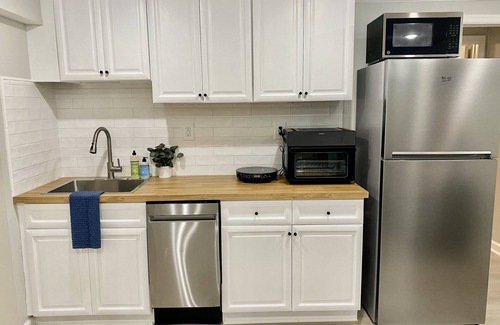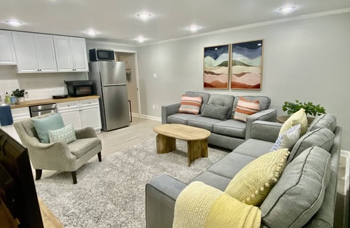 Need a central home away from home for 30 days or more? Completely independent light-filled basement apartment of a single family home in a nice neighborhood. Enjoy your own private entrance, private full-size laundry machines, stylish living & dining space, kitchenette, queen bedroom & full bathroom with soaker tub, & a bonus room/office. The kitchenette has a full refrigerator, microwave, dishwasher, countertop oven & air fryer and counter cooktop.