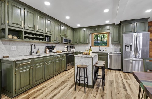 Fully Equipped Gourmet Kitchen: Prepare delicious meals in our expansive kitchen—equipped with two sinks, brand new stainless steel appliances (including a gas stove with built-in griddle), granite countertops, and our famous Pay-It-Forward pantry, often stocked with spices, essentials, and treats left by previous guests! The handmade 8’ black walnut river table seats your whole group comfortably.