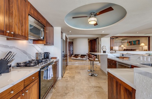 The fully-equipped gourmet kitchen is a chef's dream and is outfitted with pro-grade cookware, brand-new stainless steel appliances and triple-filtered water from the tap. The locally-sourced Parota solid wood cabinetry and woodwork provides a rich feel throughout the condo. There is also a full-size washer/dryer in the unit to make packing so much easier.