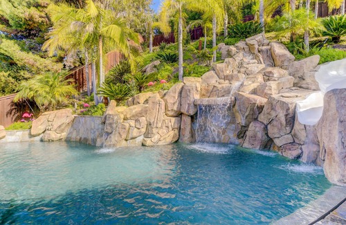 Treat yourself to one of the most amazing backyards in all of San Diego County complete with full outdoor kitchen with fire place and 60" tv, regulation size 4 hole putting green, vanishing edge 8' deep pebble tech pool, 6' deep jacuzzi, HUGE waterfall and slide plus more! Best of all the entire backyard entertainment area has FULL privacy so no neighbors peering in on your while your enjoying. The interior is 2k sq ft, remodeled, and is the perfect property for families and larger quiet groups!