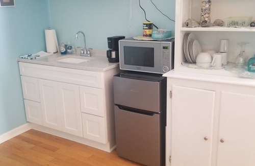 Private deck entrance to a spacious room separate from the house. Large airy bathroom with a rain shower. Small kitchenette to brew that morning coffee. The suite is large with a separate lounge area. Control your own climate with an in-suite mini-split HVAC system.
