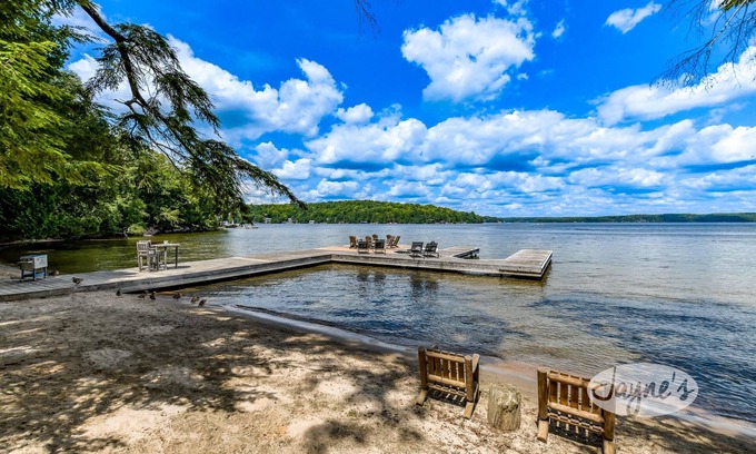 CAMP MUSKOKA, where you will have all-round privacy, as the property is surrounded by trees on either side with no neighbours in view. The property includes a sandy beach and 400 feet of frontage. The northern exposure ensures an excellent view of sunrises and sunsets. The cottage is also equipped with a private beach volleyball court as well as huge open docks with plenty of seating and lounging.
