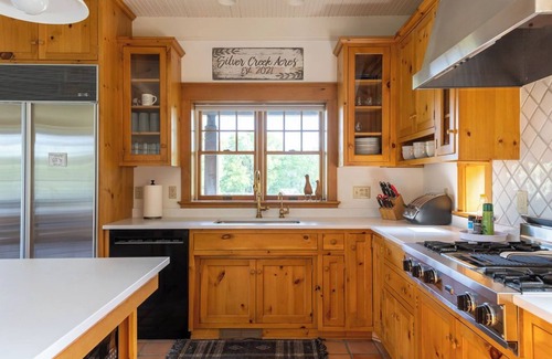 Whether you’re looking for a romantic getaway, a family vacation, a girls weekend, or a beautiful place to stay for a nearby event, you’ll find Silver Creek Acres your perfect home-away-from-home. This home is incredibly secluded with mature pine trees lining the entire property. The beautiful rolling hills bring in a variety of wildlife. Relax and unwind by one of two fireplaces inside the home, or cozy up outside with a smokeless fire pit within steps of a 53 jet hot tub!