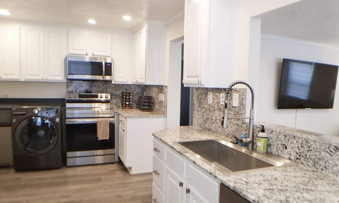Additional features include granite countertops, stainless new appliances, central air conditioning, garage and driveway parking, washer/dryer, Samsung Ultra HD 75″ TV, and fast and stable Fiber based internet great for work-from-home professionals. Note, this is a private home, not a shared property with mother in law unit, etc. This unique home welcomes you and your arrival to Salt Lake City.