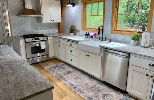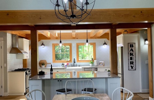 With its separate spaces, our home is ideal for a cozy get together. Amenities include an indoor fireplace, a full-sized kitchen with gas range, a jetted tub, multiple workspaces and fast wireless Internet access. Multiple brain spaces make this the ideal spot for remote work. Our full kitchen is well equipped with a large island for working and gathering.