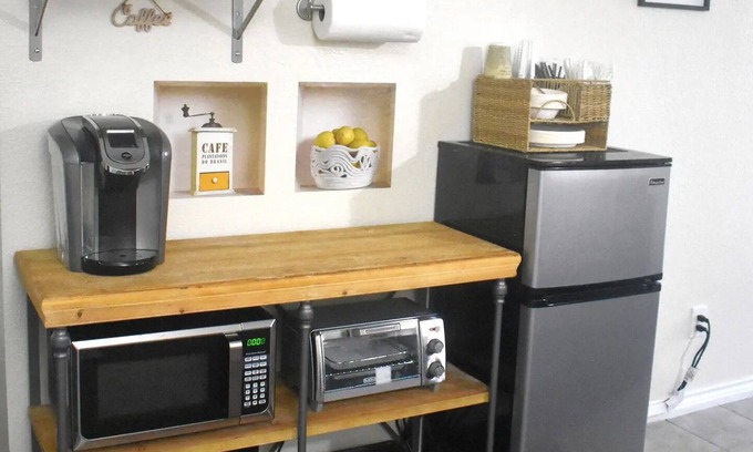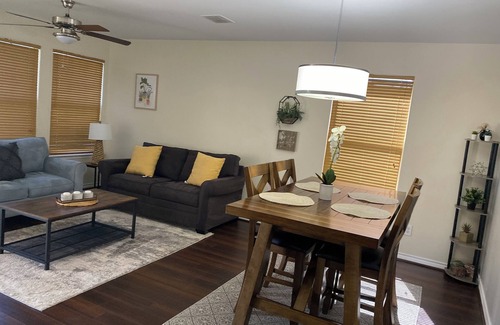 Located within minutes to Cedar Hill State Park, this space includes a full bedroom with a spacious walk-in closet and in-suite bathroom with tub. The space has its own separate entry and the suite shares a door with the main house, but the door is locked for complete privacy. This suite includes a half bath, living area with TV, and dining area for 4. This space is equipped with kitchen basics to allow you to prepare simple meals, air-fry or microwave frozen treats, and enjoy coffee or tea.