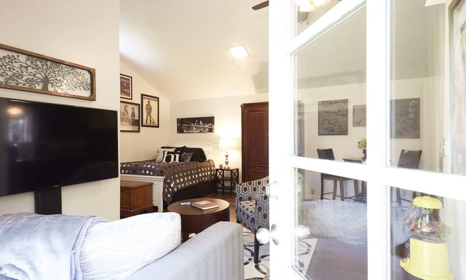 Fully equipped studio guesthouse with private street entrance and yard. Queen size bed and optional queen size quality inflatable bed to accommodate 4 guests. 55" smart TV, kitchen, dining table for 2, well equipped kitchen, wireless internet, comfortable sitting area. One block from charming Willow Glen's Lincoln Ave with restaurants and shops. Convenient to downtown San Jose, SAP Center, public transportation.