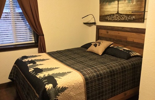 It's not the Ritz, but this “cabin-themed” guest house is very clean and private! There is a queen bed, a full size futon, an inflatable full size mattress, and a Graco crib upon request. Extra sheets and blankets are provided. Possibly best suited to families due to the curtain-only bedroom and only one proper bed.