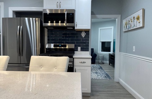 This new construction has an open layout with a welcoming living room, 2 bedrooms, and an eat-in kitchen complete with black stainless steel appliances, quartz countertops, recessed lighting, and under-lit cabinets. The bathroom has a tiled floor, new faucets, fixtures, and a pedestal sink. The unit is equipped with high-speed internet, a smart TV, AC & Heating, an entrance deck, and private parking (garage rental available). Perfect for UMass Medical, Bio-tech, and local stays!