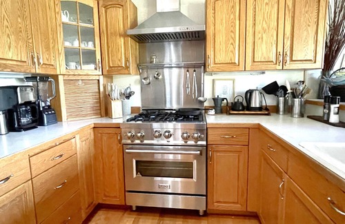 The open kitchen is fully equipped to prepare a gourmet feast, and includes a coffee maker, blender/food processor, commercial grade waffle maker and cookbooks.