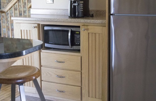 Upstairs features cathedral ceilings, large south facing windows, well-lit dedicated office space, and family room with a small couch large enough to sleep on if you are not too tall, as well as a closet for your use. There are some books, games, puzzles and toys available as well.