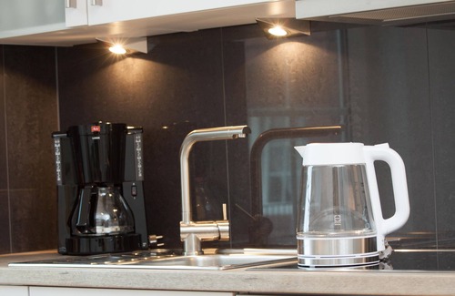The kitchen is equipped with an oven, a stovetop, and a refrigerator, as well as a coffee maker, cookware, and a toaster. And you won't have to pack extra clothes, because you'll also have access to laundry facilities. Other amenities include a living room, an ironing board, heating, and a dining table.