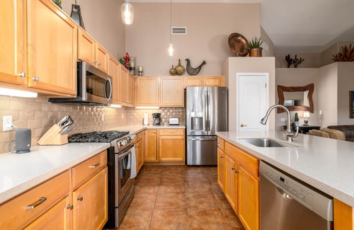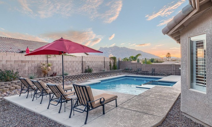 We invite you to enjoy our newest home. Enjoy our brand new pebble tech pool and spa with incredible views of the Catalina Mountains. You can even heat the pool for an additional fee of $400.00 per week. Spa heat is no charge. New quartz countertops in the kitchen, freshly painted interior, and new furniture, pool table and large flat screen tvs for your vacation enjoyment. We've added a workstation monitor, keyboard and mouse for your convenience.