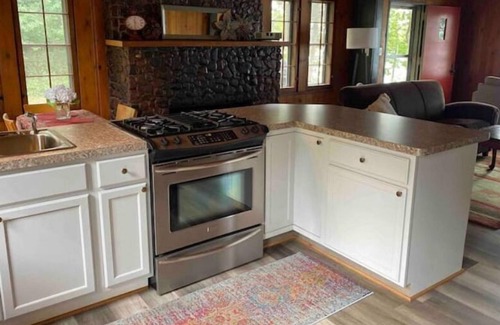 You will enjoy our two-bedroom lakefront cabin with private lake access, living room, kitchen, full bath, deck with sitting area, outdoor dining, grill and fire pit.