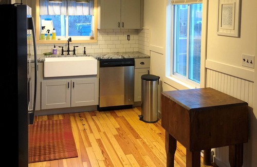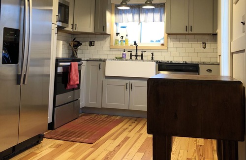 The electronic lock grants you keyless access to your getaway retreat. You open the door and are greeted with antique hardwood floors, farmhouse chic decor, ship-lap walls, and much more. The kitchen to your right has just been renovated with new cabinets, new stainless appliances, granite counters and farmhouse sink. You drop your bags on the antique butcher block island and are very happy with your rental selection. You head towards the back of the house where you find a beautifully renovated bathroom adorned with subway tile surround, rain forest shower, stenciled tile floors and beadboard walls. The air conditioners are doing their job and keeping the house a cool 65 degrees.
