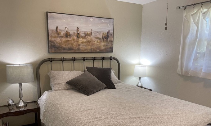 Home has three private rooms available, each with a queen size bed. Plus an office with a futon. The West room features full lite door directly to a deck with table/chairs and backyard. The East room features an extra large closet that could be converted to an office/work space if needed.